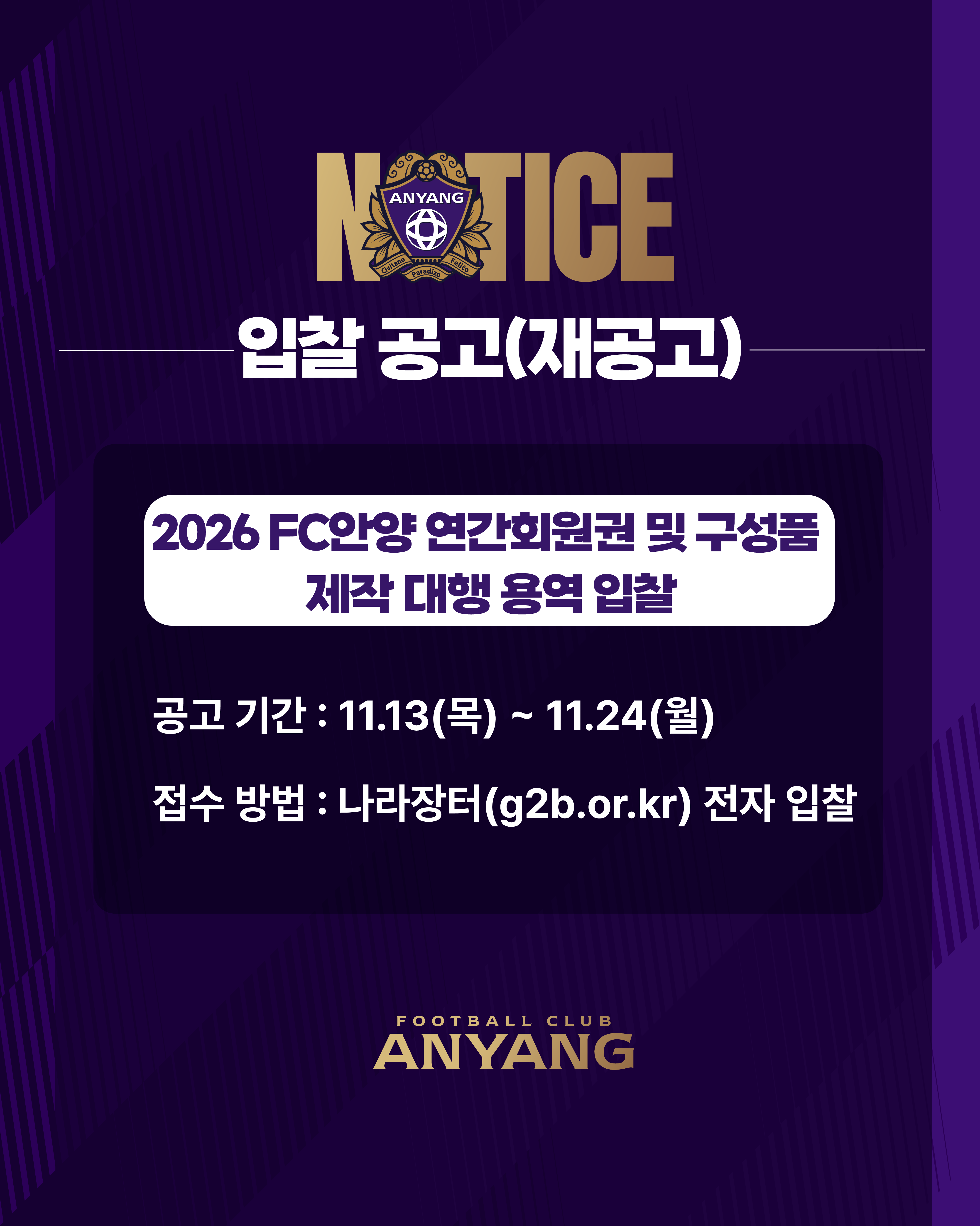 2026년 FC안양 연간회원권 및 구성품 제작 대행 용역 입찰(재공고)
